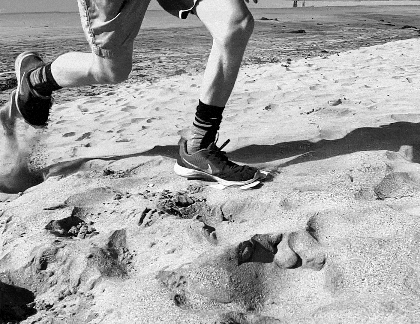 Running in sand is slower, causing 1.6x more energy loss due to the unstable surface requiring extra effort to stabilize the body and push off.