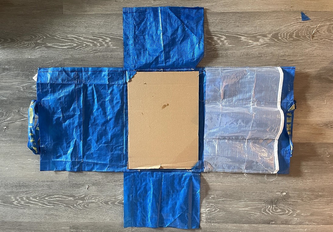 Sewed canvas with recycled PP panels to provide structure. Panels are attached via buttons.
